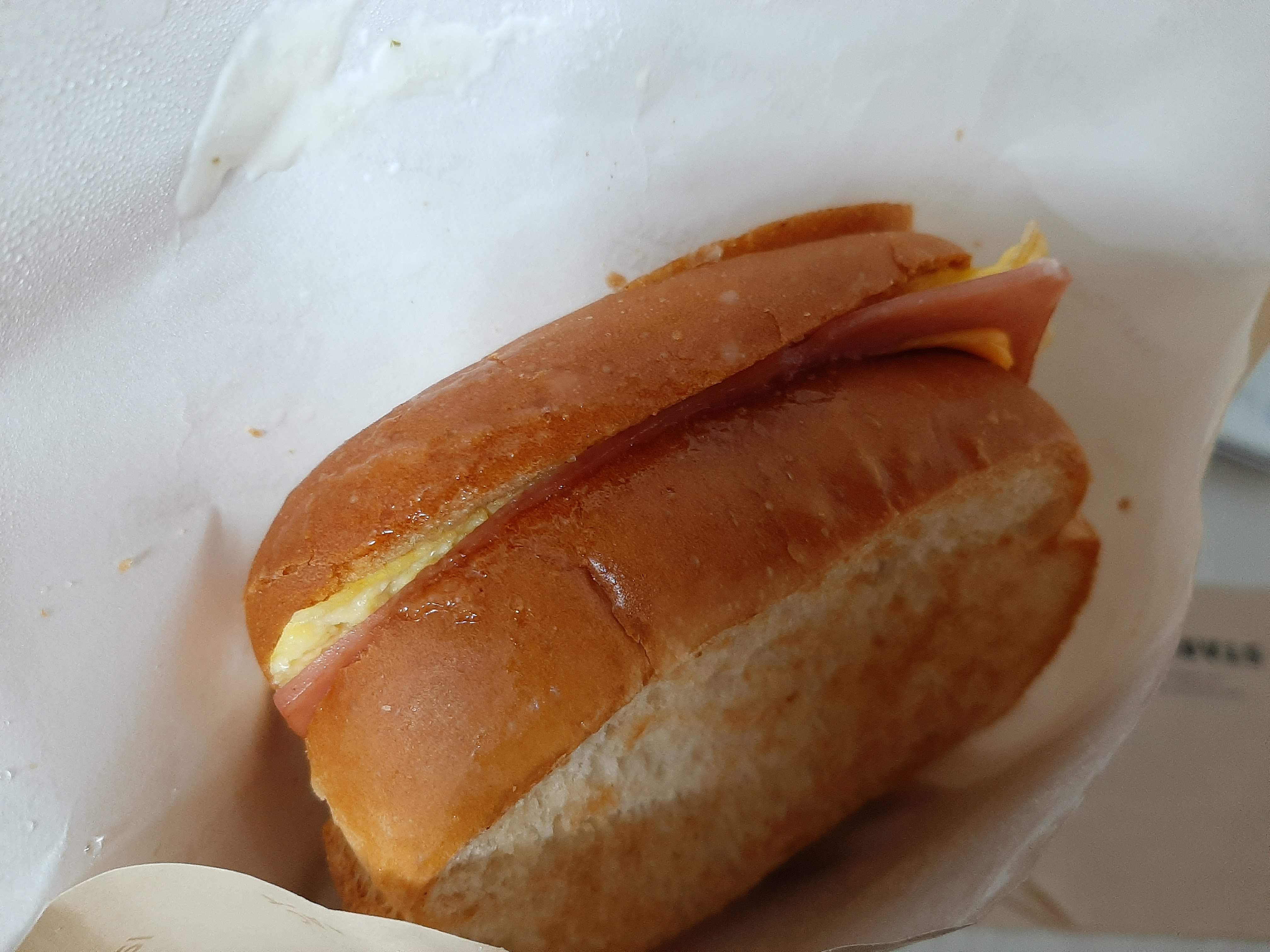 오른쪽 갈색 포장지가 허니갈릭햄치즈(3,000원), 왼쪽 흰색 포장지가 햄치즈 토스트(2,600원)입니다.